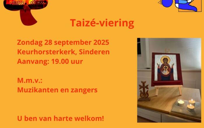 Zondagavond 28 september om 19.00u, in de Keurhorst. Een Taizéviering is een vorm van gebed en bezinning die gekenmerkt wordt door korte, herhaalde liederen stilte en Bijbellezingen. De viering wordt vaak uitgevoerd in de sfeer...